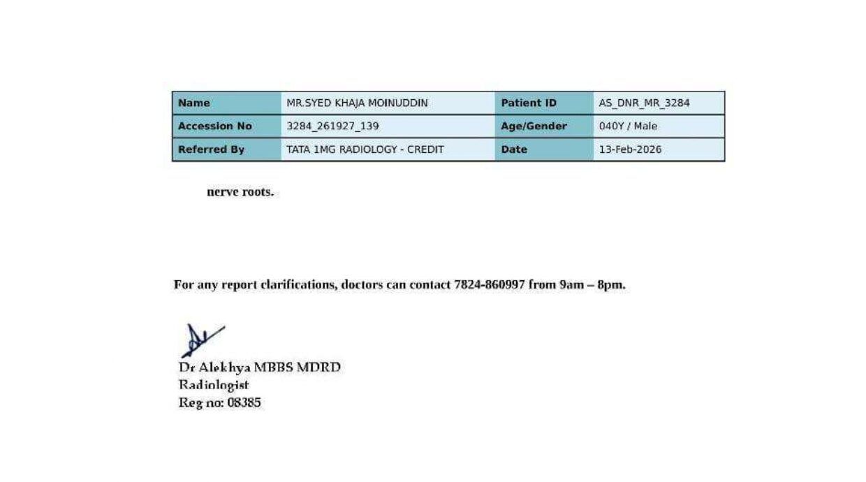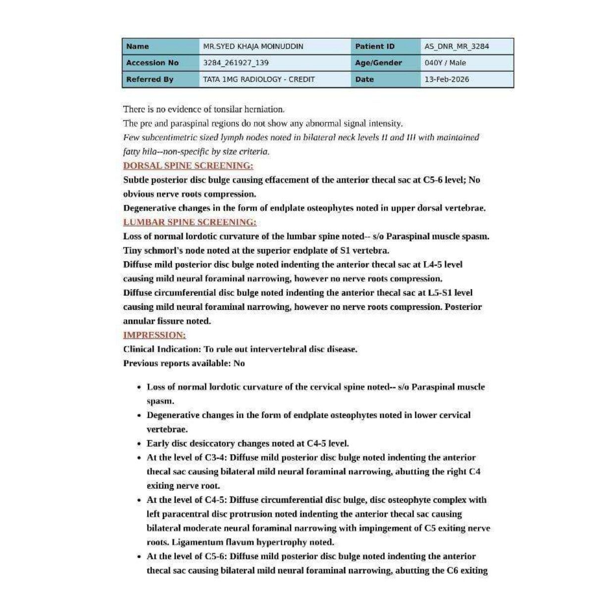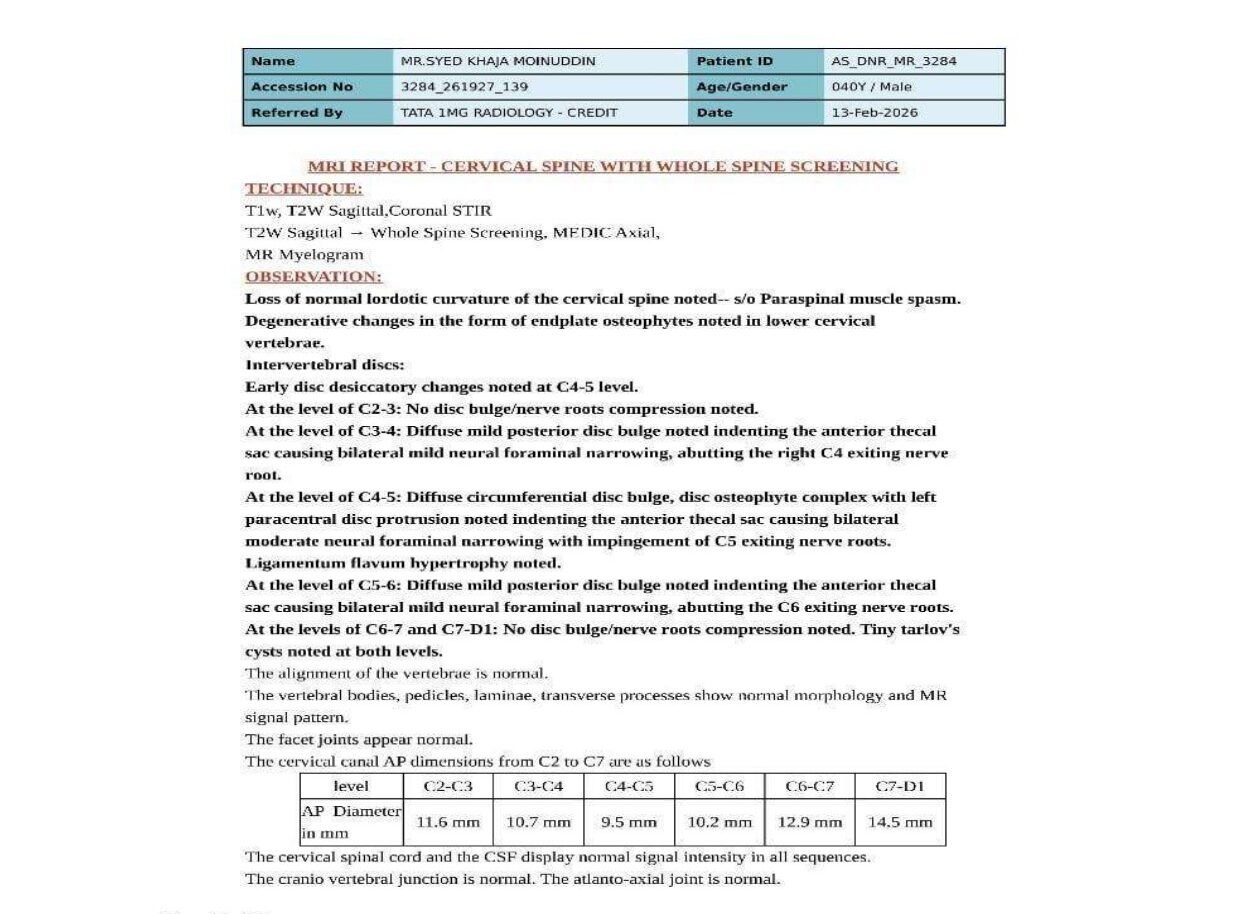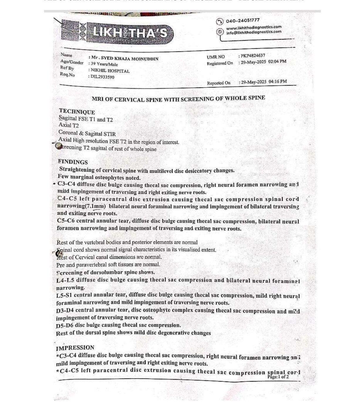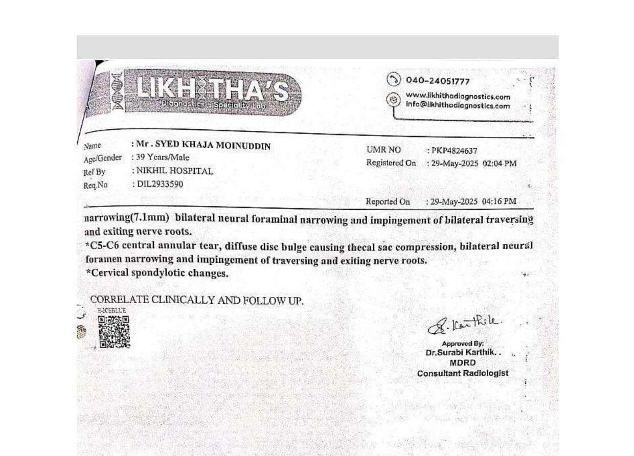 Mr. Syed Khaja Moinuddin, a 40-year-old, experienced gradually worsening neck painthat progressed from mild stiffness to chronic discomfort. The pain radiated to both upper limbswith numbness and tingling, restricting his daily activities and neck movements.